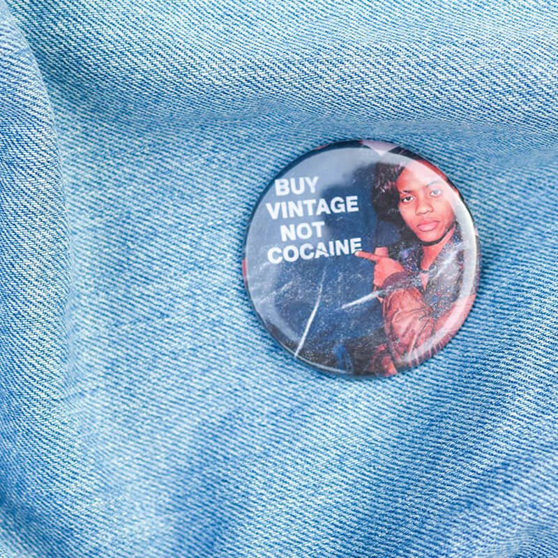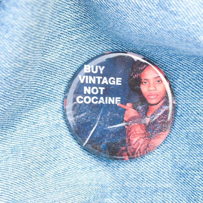 Buy Vintage Not Cocaine Classic Button. White button, heavy black type: Buy Vintage Not Cocaine.