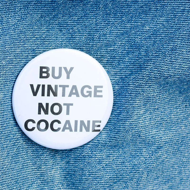White button, heavy black type: Buy Vintage Not Cocaine Text Logo