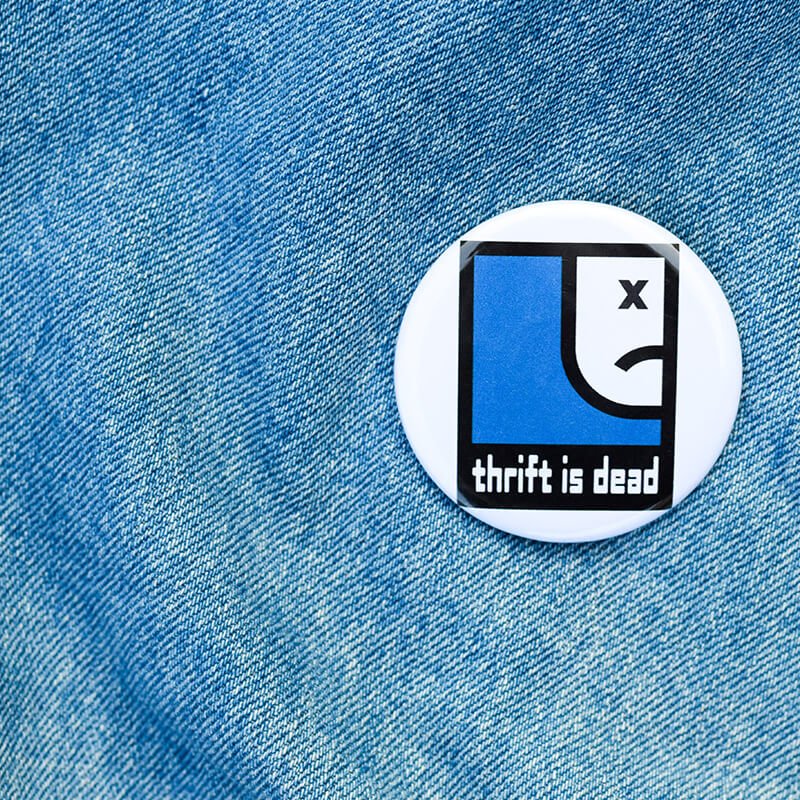 A clean icon in blue/black/white with a deadface and the line Thrift is Dead. Minimal design, maximum side-eye.